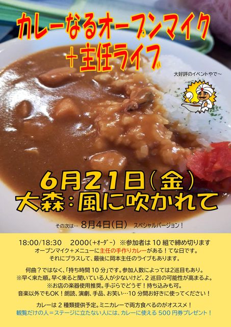 ¡ü³µÍ× £¶·î£²£±Æü¡Ê¶â¡Ë Â翹¡§É÷¤Ë¿á¤«¤ì¤Æ Âè7²ó ¥«¥ì¡¼¤Ê¤ë¥ª¡¼¥×¥ó¥Þ¥¤¥¯¡Ü¼çǤ¥é¥¤¥Ö 18:00/18:30 2000(+޵ްŽÀŽÞް) ¢¨¥«¥ì¡¼¤Ïɬ¤º¤´Ãíʸ²¼¤µ¤¤¡£ ¡¡ ¡üÆâÍÆ ¥ª¡¼¥×¥ó¥Þ¥¤¥¯¡Ü¥á¥Ë¥å¡¼¤Ë¼çǤ¤Î¼êºî¤ê¥«¥ì¡¼¤¬¤¢¤ë¡ª¤Æ¤ÊÆü¤Ç¤¹¡£ ¤½¤ì¤Ë¥×¥é¥¹¤·¤Æ¡¢²¬ËܼçǤ¤Î¥é¥¤¥Ö¤â¤¢¤ê¤Þ¤¹¡Ê30¡Á40ʬ¡©¡Ë ¥«¥ì¡¼¤Ï2¼ïÎàÄó¶¡Í½Äê¡£¥ß¥Ë¥«¥ì¡¼¤ÇξÊý¿©¤Ù¤ë¤Î¤¬¥ª¥¹¥¹¥á¡ª ´ÑÍ÷¤À¤±¤Î¿Í¡á¥¹¥Æ¡¼¥¸¤ËΩ¤¿¤Ê¤¤¿Í¤Ë¤Ï¡¢¥«¥ì¡¼¤Ë»È¤¨¤ë500±ß·ô¥×¥ì¥¼¥ó¥È¡ª ¡ü¥¨¥ó¥È¥ê¡¼Â¾ ¾ÜºÙ¤Ï¤³¤Á¤é¤ò¤´Í÷¤¯¤À¤µ¤¤¡£ https://okamotosyunin.jimdofree.com/cu
