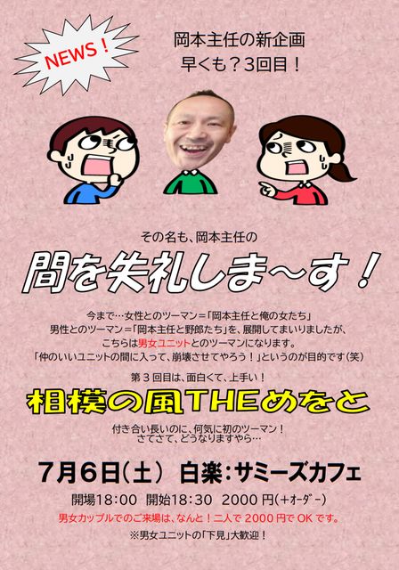 ¡ü³µÍ× £··î£¶Æü¡ÊÅÚ¡Ë Çò³Ú¡§¥µ¥ß¡¼¥º¥«¥Õ¥§ https://x.gd/mvphK ²¬ËܼçǤ¤Î¡Ö´Ö¤ò¼ºÎ餷¤Þ¡Á¤¹¡× Âè3²óÀï ÁêÌϤÎÉ÷THE¤á¤ò¤È 18:00/18:30 2000(+޵ްŽÀŽÞް) ¡ü¥¿¥¤¥à¥¹¥±¥¸¥å¡¼¥ë 18:30¡¡°§»¢ 18:35¡¡ÁêÌϤÎÉ÷THE¤á¤ò¤È 19:10¡¡²¬ËܼçǤ 19:40¡¡µÙ·Æ 19:50¡¡²¬ËܼçǤ 20:25¡¡ÁêÌϤÎÉ÷THE¤á¤ò¤È 20:55¡¡Ž±ŽÝŽºŽ°ŽÙ޾ޝ޼ޮŽÝ 21:10¡¡½ª±é ¡üÆâÍÆ ¿·´ë²è¡ªÃ˽÷¥æ¥Ë¥Ã¥È¤È²¬ËܼçǤ¤Î¥Ä¡¼¥Þ¥ó¤Ç¤¹¡£ Â裳²óÌܤϡ¢ÁêÌϤÎÉ÷THE¤á¤ò¤È ÌÌÇò¤¯¤Ã¤Æ¡¢¾å¼ê¤¯¤Ã¤Æ¡¢¤â¤¦»²¤Ã¤Á¤ã¤¤¤Þ¤¹¡ª ¡üÆÃŵ Ã˽÷¥«¥Ã¥×¥ë¤Ç¤Î¤´Íè¾ì¤Ï¡¢¤Ê¤ó¤È