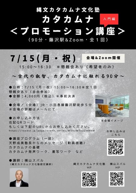 Æìʸ¥«¥¿¥«¥à¥Êʸ²½½ÎǧÄê¹Ö»Õ¤Î²£»³¥¹¥Ð¥ë¤È¿½¤·¤Þ¤¹¡£ 7/15(·î)¤ËÆ£Âô»Ô¤Ç³«ºÅ¤µ¤ì¤ë ¥«¥¿¥«¥à¥Ê¥Õ゚¥í¥â¡¼¥·¥ç¥ó¹ÖºÂ¡ÊÆþÌçÊԡˤȥ¹¥Ô¥ê¥Á¥å¥¢¥ë¤ªÏä·²ñ¡Ê¸òή²ñ¡Ë¤Î¤´°ÆÆâ¤Ç¤¹¡Ê¤É¤Á¤é¤âÍÎÁ¤Î¥¤¥Ù¥ó¥È¤Ç¤¹¡Ë¡£ ¡¼¡¼¡¼ ¡ 15:00¡Á16:30¡¡¥«¥¿¥«¥à¥Ê¡Ò¥Õ゚¥í¥â¡¼¥·¥ç¥ó¹ÖºÂ¡Ó¡ÊÆþÌçÊÔ¡Ë¢¨90ʬ£±²ó ¥«¥¿¥«¥à¥Ê¤ò½é¤á¤Æ³Ø¤ÖÊý¤òÂоݤˡ¢¥«¥¿¥«¥à¥Ê¤Î´ðÁäò³Ø¤Ó¡¢¥ï¡¼¥¯¤ò¸ò¤¨¤Æ¥«¥¿¥«¥à¥Ê¤Ë¿¨¤ì¤ë90ʬ¡£ ¥«¥¿¥«¥à¥Ê¤Î´ðÁäò³Ø¤Ó¤Þ¤¹¡£¿Þ¾ÝÉä½ñ¼Ì¥ï¡¼¥¯&¥«¥¿¥«¥à¥Ê¥¦¥¿¥ÒȯÀ¼¥ï¡¼¥¯¤ò¹Ô¤¤¤Þ¤¹¡£ ²ñ¾ì¤ÏÆ£Âô±ØÅÌÊ⣵ʬ¡£Zoom