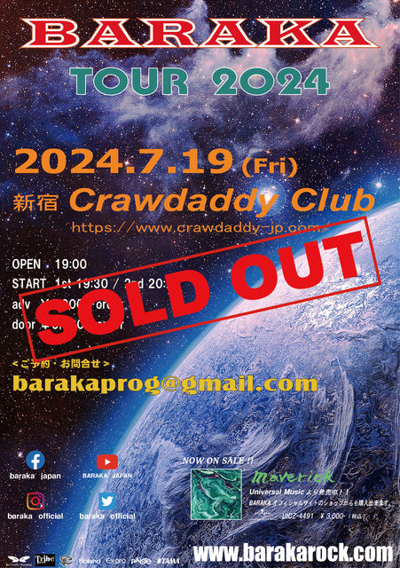 7/19 本日のライブ BARAKA TOUR 2024 OPEN 19:00 START 19:30 CHARGE 予約\5000 / 当日\5500 SOLD OUTとなりました。 よろしくお願いいたします!!