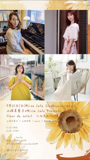 2024/07/21 (日)銀座Miiya cafe ☆Miiya Cafe 22nd Anniversary☆ 上保美香子×Miiya Cafe Presents Vol.2 『 fleur de soleil ひまわりに憧れて 』 open:11:30 / start: 12:00 出演: 上保美香子 / 上村叶恵 / kaho* / 南紗椰 / 入場料: 前売り3,900円・当日4,400円(別1オーダー) 出演時間:13:20〜13:55 上村叶恵 ※11:15に会場前にてシャッフル整理券をお配りし、 その場で入場順を決めさせて頂きます。 ♪出演者(敬称略)及び出演時間帯♪ 12:00〜12:35 南紗椰 12:40〜13:1