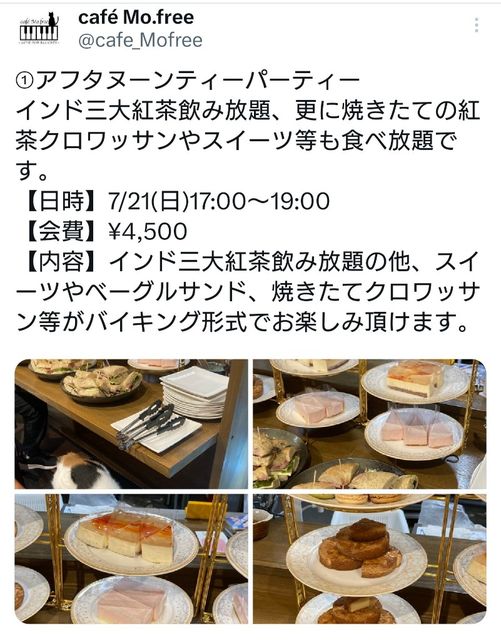 東京都練馬区大泉学園駅から徒歩10分の所にある 「カフェ モ フリー」というお店の アフタヌーンティーパーティーというスイーツビュッフェです🍰 インド三大紅茶飲み放題、更に焼きたての紅茶クロワッサンやスイーツ等も食べ放題です。 【日時】7/21(日)17:00〜19:00 【人数】4名まで 【会費】¥4,500 【内容】インド三大紅茶飲み放題の他、スイーツやベーグルサンド、焼きたてクロワッサン等がバイキング形式でお楽しみ頂けます。 https://mo-free.com/ お店のルール ☆開始時間15分前には、全員揃うこと ☆ドタキャンは禁止され