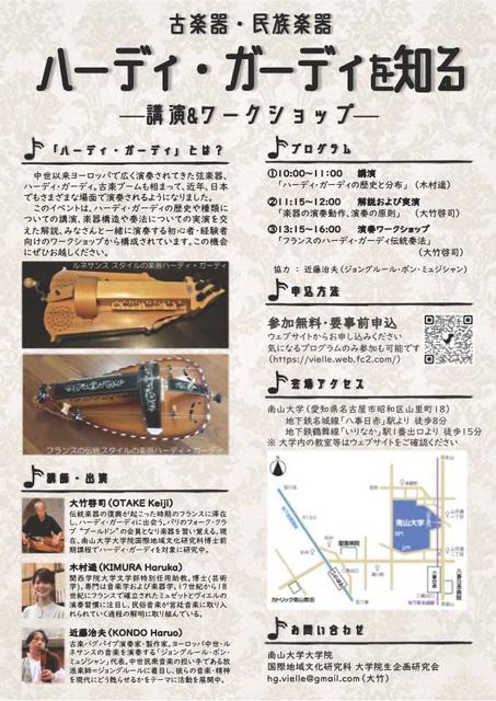 講演会・ワークショップ 『古楽器・民族楽器「ハーディ・ガーディ」を知る』 開催日:2024年7月21日(日曜日) 会場;愛知県名古屋市 南山大学 B-11教室(B棟1階) 案内および申し込み https://vielle.web.fc2.com/