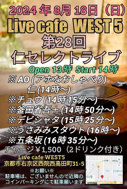 12時オープン 13時スタート チャージ1500円(2ドリンク付き) Live cafe WEST 5 京都市右京区西院西高田町31-5 https://west5live.com/