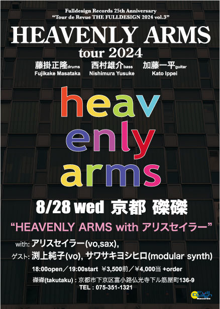 8/28(水) 京都磔磔 “HEAVENLY ARMS with アリスセイラー” HEAVENLY ARMS[藤掛正隆(ds) 西村雄介(b) 加藤一平(g)] with アリスセイラー(vo,sax) +guest:渕上純子(vo), サワサキヨシヒロ(modular synthesizer) 18:00open 19:00start 予約¥3,500 当日¥4,000(+order) 磔磔 : 京都市下京区富小路仏光寺下ル筋屋町136-9 TEL : 075-351-1321 https://www.geisya.or.jp/~takutaku/
