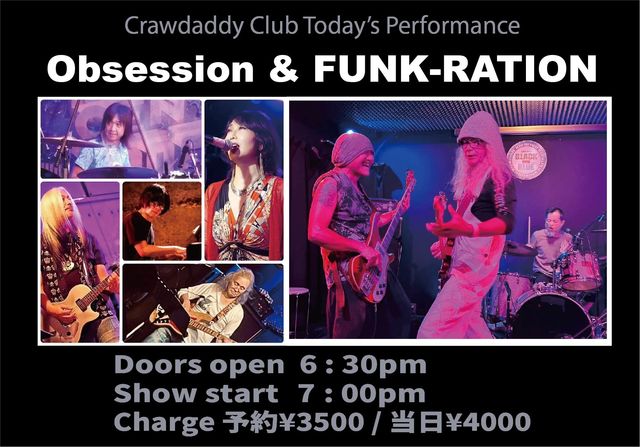 8/10 ËÜÆü¤Î¥é¥¤¥Ö¡¡ Obsession & FUNK-RATION LIVE¡¡ OPEN 18:30 START 19:00 CHARGE ͽÌó\3500 / ÅöÆü\4000¡¡ ¤è¤í¤·¤¯¤ª´ê¤¤¤¤¤¿¤·¤Þ¤¹¡ª¡ª