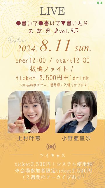 2024/08/11 (日)板橋cafeファイト! ●書いて●書いて▼書いたら え が お ♪vol.9♫ open 12:00 / start 12:30 出演: 小野亜里沙 / 上村叶恵 入場料: 3,500円(別1drink) 出演時間: 個人ステージ45分、セッショントーク50分 ※当日はチケット番号順でのご入場となります。 ※配信あり *ご予約方法 yoyaku.kanae@gmail.com 宛に ◆お名前 ◆枚数 ◆予約したいライブ(日程・場所) ◆受け取り方法(事前ライブにてor郵便発送or当日受取) をご記入の上送信をお願いいたします。 アクセ