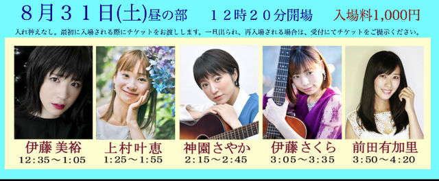 2024/8/31 (土)関内クロスストリート 出演時間 13:25- 13:55 上村叶恵 入場料 1,000円(途中入退場OK) http://www.isezaki-crossstreet.com/ganba_sslivehtml.html ご予約なしでご参加いただけます。 是非プラッとお立ち寄りください アクセス:http://www.isezakicho.or.jp/~ueda/cs/access.html