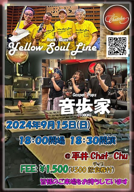 ゴスペルヴォーカルグループ「音歩家(OTOBOKE)」さん、チャッチュにて2度目のライブです! 今回のジョイントバンドはエリッククラプトン&ブルース系のYellow Soul Line さん。 ★2024年9月15日(日) 18:00 open 18:30 start ★ミュージックチャージ 1,500円 (500円メニューチケット付) +ご飲食をお願いいたします ※席数に限りがある為、ご予約様優先とさせて頂きます。 ご予約は当店主へのメッセージか、ご出演者までお願いいたします。 皆さまのご予約、ご来店を心よりお待ちしております^^