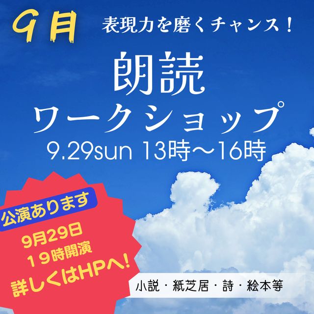 河野匡泰事務所がお届けする、心温まる朗読ワークショップがやってきます!🎙 イベントの特徴: ・青空文庫の名作から、絵本や紙芝居まで、幅広いジャンルの作品を楽しむチャンス! ・自分の感動をシェアしよう! ・自作作品も大歓迎です。 ・子供から年配者まで、誰もが楽しめるアットホームな雰囲気をお約束します。 対象者: 俳優や声優を目指す方から、文学を愛する一般の皆さんまで、どなたでも歓迎! 幅広い年齢層に合わせ、笑顔と感動が広がる場をご用意しています。 日程と場所: 日時: 8/29(日) 13時〜16時 場所