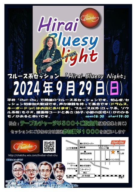 ブルース系セッション開催します! ★2024年9月29日(日) 18:30〜 OPEN 19:00〜 START 〜22:00 音出し終了 ★料金 ・テーブルチャージ500円 ・演奏参加者は別途1,000円 ※飲食店に付き別途ご飲食を沢山してくださいネ^^ ★ホストメンバー ☆ティーチャー山口&スチューデンツ ・山口 哲也 _ Bluesharp/Vo./MC ・那須 英一 - Bass ・高山 哲哉 _ Drums ・上野 邦雄 _ Guitar 皆様のご予約、ご参加を心よりお待ちしております!!