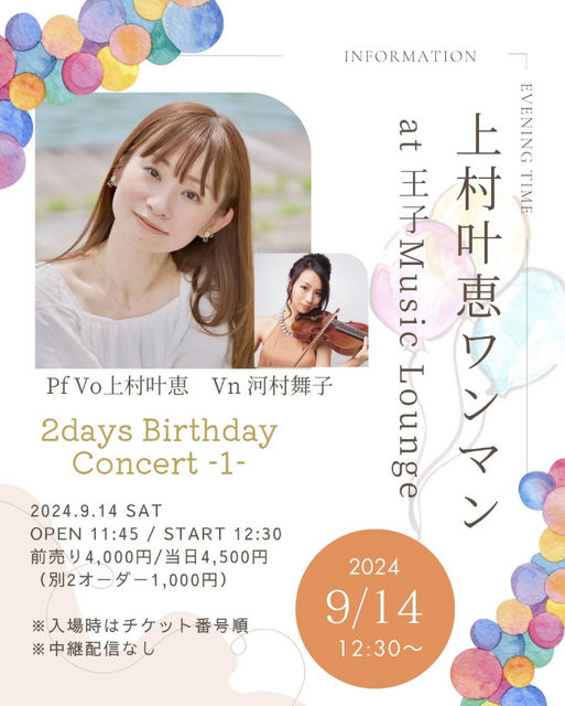 2024/09/14 (ÅÚ)²¦»ÒMusic Lounge ¾å¼³ð·Ã 2days Birthday Concert -1- ¡Á¿·¤¿¤Ê¾ì½ê¤Ç¿´ÃϤ褯¤Ò¤À¤Þ¤ê¤Î¸á¸å¤ò¡Á open:11:45 / start: 12:30 ½Ð±é: ¾å¼³ð·Ã, Vn ²Ï¼Éñ»Ò / Æþ¾ìÎÁ: Á°Çä¤ê4,000±ß/ÅöÆü4,500±ß¡ÊÊÌ2¥ª¡¼¥À¡¼1,000±ß¡Ë¡¡ 40ÀʸÂÄê open»þ¤ÎÆþ¾ì¤Ï¥Á¥±¥Ã¥È¡Ê¤´Í½Ìó¡ËÈÖ¹æ½ç¤È¤Ê¤ê¤Þ¤¹¡£ ÇÛ¿®¤Ï¤´¤¶¤¤¤Þ¤»¤ó ¤´Í½Ìó¤Ï¤³¤Á¤é¤è¤ê http://uemura-kanae.com/0915-2/ Tokyo Guesthouse Oji music lounge ¢©114-0023 ÅìµþÅÔË̶èÂìÌîÀÃúÌÜ£´
