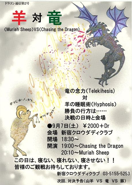 9/7 ËÜÆü¤Î¥é¥¤¥Ö¡¡ Chasing the Dragon(as Progressive Rock Cover) & Muriah Sheep¡Êas Uriah Heep) Live¡¡ OPEN 18:30 START 19:00 CHARGE 2000±ß¡¡ ¤è¤í¤·¤¯¤ª´ê¤¤¤¤¤¿¤·¤Þ¤¹¡ª¡ª