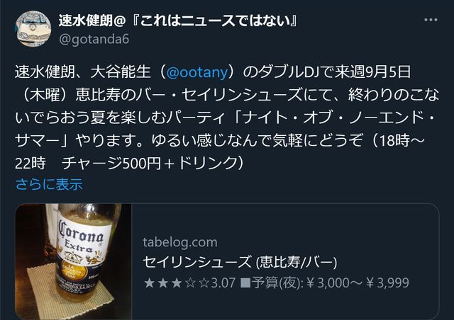 ®¿å·òϯ@¡Ø¤³¤ì¤Ï¥Ë¥å¡¼¥¹¤Ç¤Ï¤Ê¤¤¡Ù@gotanda6 ®¿å·òϯ¡¢ÂçëǽÀ¸¡Ê@ootany ¡Ë¤Î¥À¥Ö¥ëDJ¤ÇÍè½µ9·î5Æü¡ÊÌÚÍˡ˷ÃÈæ¼÷¤Î¥Ð¡¼¡¦¥»¥¤¥ê¥ó¥·¥å¡¼¥º¤Ë¤Æ¡¢½ª¤ï¤ê¤Î¤³¤Ê¤¤¤Ç¤é¤ª¤¦²Æ¤ò³Ú¤·¤à¥Ñ¡¼¥Æ¥£¡Ö¥Ê¥¤¥È¡¦¥ª¥Ö¡¦¥Î¡¼¥¨¥ó¥É¡¦¥µ¥Þ¡¼¡×¤ä¤ê¤Þ¤¹¡£¤æ¤ë¤¤´¶¤¸¤Ê¤ó¤Çµ¤·Ú¤Ë¤É¤¦¤¾¡Ê18»þ¡Á22»þ¡¡¥Á¥ã¡¼¥¸500±ß¡Ü¥É¥ê¥ó¥¯¡Ë https://x.com/gotanda6/status/1829486943073423561