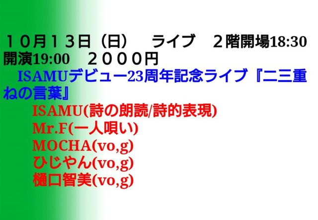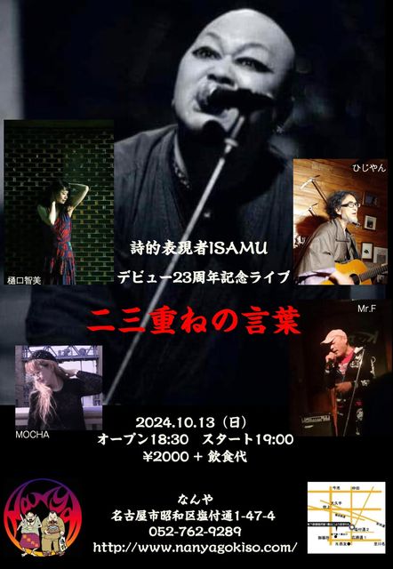 2001ǯ10·î13Æü(ÅÚ)¡ØÂè1²ó »í¤Î¥Ü¥¯¥·¥ó¥°°¦Ãθ©Âç²ñ ËÜÀï¡Ù@º£ÃÓ¡ÖTokuzo¡×¤Ë¤Æ¥Ç¥Ó¥å¡¼¤·¤Æ23ǯ¡£ ¤Á¤ç¤¦¤É¥Ç¥Ó¥å¡¼23ǯÌÜ¤ÎÆü¤ÎÌë¤Ë»íŪɽ¸½¼ÔISAMU ¥Ç¥Ó¥å¡¼23¼þǯµÇ°¥é¥¤¥Ö¤ò±ï¤Îͤë´é¿¨¤ì¤ò¾·¤³«ºÅ¡£ ¢¢10/13(Æü) "»íŪɽ¸½¼ÔISAMU ¥Ç¥Ó¥å¡¼23¼þǯµÇ°¥é¥¤¥Ö" ÂêÌÜ: Æó»°½Å¤Í¤Î¸ÀÍÕ ¾ì½ê: ¸æ´ï½ê¤Ê¤ó¤ä http://nanyagokiso.com ½»½ê: °¦Ãθ©Ì¾¸Å²°»Ô¾¼Ï¶è±öÉÕÄÌ1-47-4 ÅÅÏÃ: 052-762-9289 ¸òÄÌ: Ãϲ¼Å´ÄáÉñÀþ¡¦ºùÄÌÀþ¡Ö¸æ´ï½ê¡×1Èֽиý¤è¤êÅÌÊâ5ʬ¡£ »þ´Ö: 2³¬18»þȾ³«¾ì(³«Å¹18»þ)/19»þ³«±é ÎÁ¶â: 2000±ß(ÊÌÅÓ°û¿©Âå