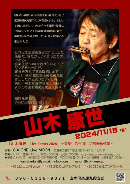 「山木倶楽部九段支部」「SIX ONE Live MOON」にて、メールにて予約受付。
