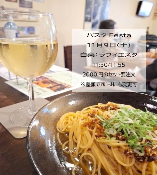 ●概要 11月9日(土) 白楽:ラフィエスタ http://www.lafiesta-jazz.jp/ 定例ライブ「パスタFesta第169回」への参加 2000円のセット要注文(差額でアルコールにも変更可) 11:30/11:55 16:00終演予定 全8組!参加予定 ●内容 土曜の午後。美味しいパスタを食べながら音楽を楽しもう♪ という、林あきひこさん主催の長年行われている定例ライブです。