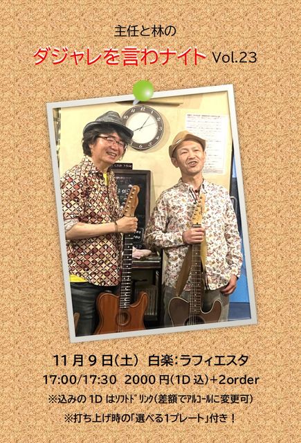 ●概要 11月9日(土) 白楽:ラフィエスタ http://www.lafiesta-jazz.jp/ 主任と林の「ダジャレを言わナイトVol.23」 17:00/17:30 2000円(1D込)+2order ※込みの1Dはソフトドリンク(差額でアルコールに変更可) ※打ち上げ時の「選べる1プレート」付き! ●タイムスケジュール 17:30-18:10 岡本主任(RC関連ソング) 18:20-19:10 林あきひこ 19:15-19:55 岡本主任 19:55-20:00 アンコールセッション 20:00〜 打ち上げ♪ ●「打ち上げ」に関して このイベントでは、終演後にその場で打ち上げを行っております。 その