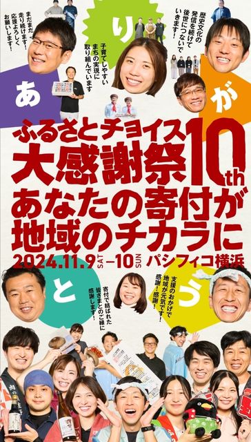昨年も行って楽しかったイベント、パシフィコ横浜で行われる、第10回 ふるさとチョイス大感謝祭に行って、その土地土地の美味しいものをいただき、ふるさと納税について、いろいろ知ろうという企画です。 このイベントの魅力は、全国各地のおいしいものをいっぱい知れるてなんと無料ということです。 今回も、初回枠を確保していますので十分に楽しめるかと思います。 (オフィシャルHPより) あなたの寄付が地域のチカラに 今年もふるさとチョイス大感謝祭を開催いたします! ふるさとチョイス大感謝祭は、自治体や地域の事業者・生産者が
