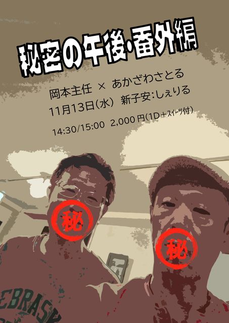 ●概要 11月13日(水) 新子安:しぇりる https://sherylcafe.jimdofree.com/ 秘密の午後・番外編 岡本主任 × あかざわさとる ツーマンライブ 14:30/15:00 2,000円(1D+スイーツ付) ●内容 平日日中のライブ「秘密の午後」の番外編! 白楽「珈琲文明」の店主でもある「あかざわさとる」とのツーマンが実現! ●タイムスケジュール 15:00 挨拶 15:05 ステージ 15:50 休憩 16:00 ステージ 16:45 アンコールセッション 17:00 終演