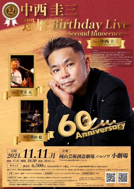■出演者: 中西圭三(ナカニシケイゾウ)Vo 平方元(ヒラカタゲン)Key 豊田稔(トヨダミノル)Per ■開催日時: 2024年11月11日(月) 開場:17:45 開演:18:30 終演 20:15(予定) ■開催場所: 岡山芸術創造劇場 ハレノワ 小劇場 〒700-0822 岡山市北区表町3丁目11-50 ■入場チケット(全席自由席): 前売り:6500円(当日は500円UP)税込 ※チケットに記載の整理番号順のご入場となります。 ※6歳以上はチケット必要、未就学児はひざ上鑑賞無料ですが、お席が必要な場合はチケットが必要です。 ■プレイガイド 岡山