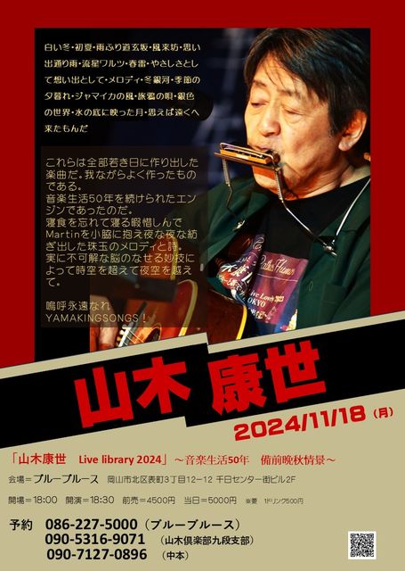 2024年11月18日(月) 「山木康世 Live Library 2024」 〜音楽生活50年 備前晩秋情景〜 会場=ブルーブルース 岡山市北区表町3丁目12-12 千日センター街ビル2F 086−227−5000 開場=18:00 開演=18:30 前売=4500円 当日=5000円 ※要 1ドリンク500円 予約・問合せ 086−227−5000(ブルーブルース) 090−5316−9071(山木倶楽部九段支部) 090−7127−0896(中本) yamakudan@yamaki-club.com