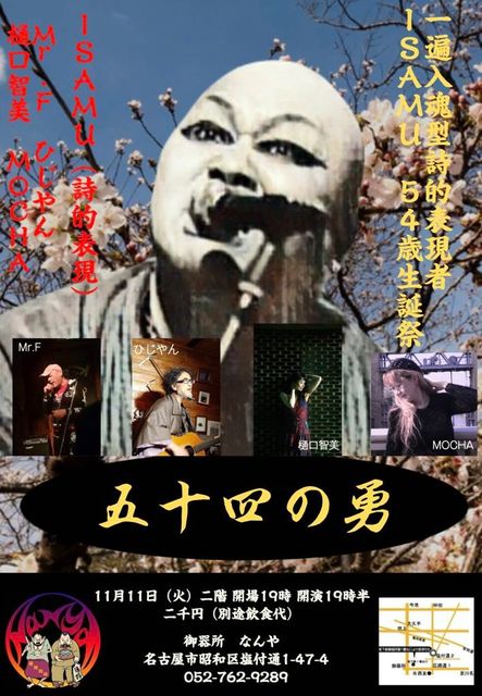 ¼«¿È¤Î54ºÐ¤ÎÃÂÀ¸Æü¤Ë±ï¡¢¿Æ¸ò¤ÎÍ­¤ë¥¢¡¼¥Æ¥£¥¹¥È¤¬½¸¤¦Ê¿Æü¤ÎÌë¤Ë³Ú¤·¤¤±ã¤ò³«ºÅ¡£ ▢11/11(²Ð)"°ìÊÓÆþº²·¿»íŪɽ¸½¼ÔISAMU 54ºÐÀ¸Ãº×" ÂêÌÜ: ¸Þ½½»Í¤Îͦ ¾ì½ê: ¸æ´ï½ê¡Ö¤Ê¤ó¤ä¡× http://nanyagokiso.com ½»½ê: °¦Ãθ©Ì¾¸Å²°»Ô¾¼Ï¶è±öÉÕÄÌ1-47-4 ÅÅÏÃ: 052-762-9289 ¸òÄÌ: Ãϲ¼Å´ÄáÉñÀþ¡¦ºùÄÌÀþ¡Ö¸æ´ï½ê¡×1Èֽиý¤è¤êÅÌÊâÌó5ʬ¡£ »þ´Ö: Æó³¬19»þ³«¾ì(18»þ³«Å¹)/19»þȾ³«±é ÎÁ¶â: 2000±ß(ÊÌÅÓ°û¿©Âå) ½Ð±é: ◉ISAMU(»í¤ÎϯÆÉ/»íŪɽ¸½) ◉Mr.F(°ì¿Í±´¤¤) ◉MOCHA(vo,hp) ◉¤Ò¤¸¤ä¤ó(vo,g)