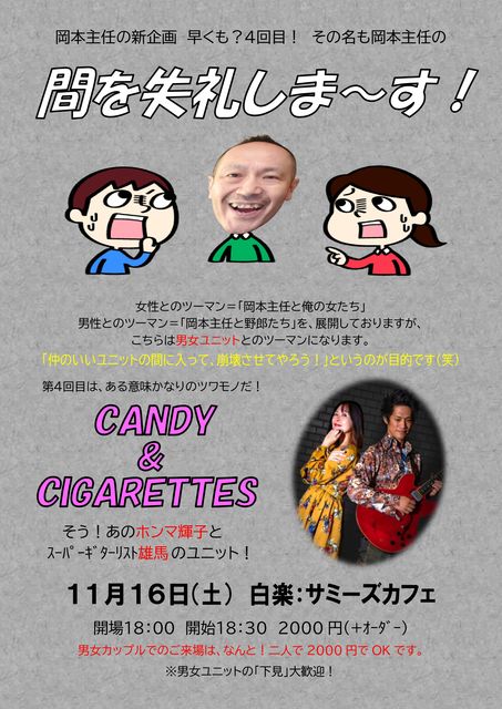 ●概要 11月16日(土) 白楽:サミーズカフェ https://x.gd/mvphK 岡本主任の「間を失礼しま〜す」 第4回戦 CANDY & CIGARETTES(輝子&雄馬) 18:00/18:30 2000(+オーダー) ●タイムスケジュール 18:30 挨拶 18:35 CANDY & CIGARETTES 19:10 岡本主任 19:40 休憩 19:50 岡本主任 20:25 CANDY & CIGARETTES 20:55 アンコールセッション 21:10 終演 ●内容 男女ユニットと岡本主任のツーマンです。 第4回目は、CANDY & CIGARETTES(輝子&雄馬) なんかとんでもない夜になりそうです(笑)。 ●特典 男女カッ