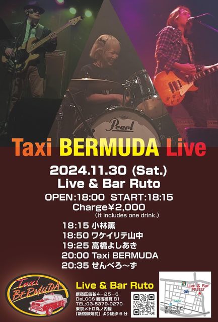 11·î30Æü(ÅÚ) ÅìµþÅÔ ¿·½É¸æ±ñ Live&Bar Ruto https://ruto.sa-kon.net/ ½Ð±é:Taxi BERMUDA (Vo&G:ÃæÂ¼ÈôÅÍ¡¢Ba&cho:Danny!¡¢Dr&cho:¥è¥·¥ß) etc... open18:00 start18:15 ¥Á¥ã¡¼¥¸ 2000±ß(1DRINKÉÕ) ¢¨ Taxi BERMUDA¤Î½Ð±é¤Ï20:00¡Á