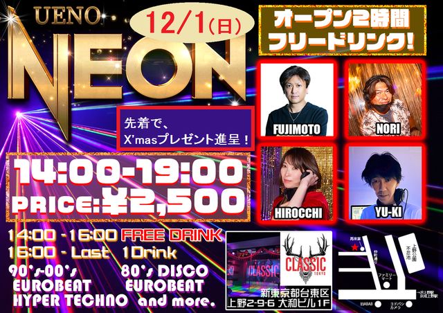 ¢£¾åÌî£Î£Å£Ï£Î ¡¡¡¡¡÷Åìµþ¾åÌîCLASSIC TOKYO 14:00¡Á19:00 2,500 ¡¡14:00¡Á16:00¡¡°û¤ßÊüÂê ¡¡16:00¡ÁLAST¡¡£±£Ä ¢¨12·î¤¬ÃÂÀ¸Æü¤ÎÊý¤Ï 500-OFF(Í×ID) ¢¨ÀèÃå¤Ç¡ÚX'mas¥×¥ì¥¼¥ó¥È¡Û¤ò¿ÊÄ衪 12·î¤Ï¿·½É¤«¤é¾åÌî¤Ë°Üư¤·³«ºÅ¡ª ¡¥ª¡¼¥×¥ó£²»þ´Ö ¥Õ¥ê¡¼¥É¥ê¥ó¥¯¡ª ¥Ñ¥éÇɤ⡢¥ê¥¹¥Ê¡¼Çɤ⡢Áᤤ»þ´Ö¤ÎÆþ¾ì¤¬¥ª¥È¥¯¤Ç¤¹¡£ ¢¤È¤Ë¤«¤¯¥ê¥¯¥¨¥¹¥ÈÃæ¿´¤ÊÁª¶Ê¡ª ¡¡90'¡Á00's¥æ¡¼¥í¡¦¥Æ¥¯¥Î¡¢80's¥æ¡¼¥í¡¦STEP¤Ê¤É¡¢¤ªµ¤¤ËÆþ¤ê¥Ê¥ó¥Ð¡¼¤òÅöÆüDJ¥Ö¡¼¥¹Á°¤Î¥ê¥¯¥¨¥¹¥ÈÍѻ桢¤Þ¤¿¤Ï»öÁ°¤ËDJ¤Þ¤Ç¤´Ï¢Íí¤¯¤À¤µ¤¤¡£³Æ¥¸¥ã¥ó¥ë20¡Á30ʬ´Ö³Ö¤ÇOnAi