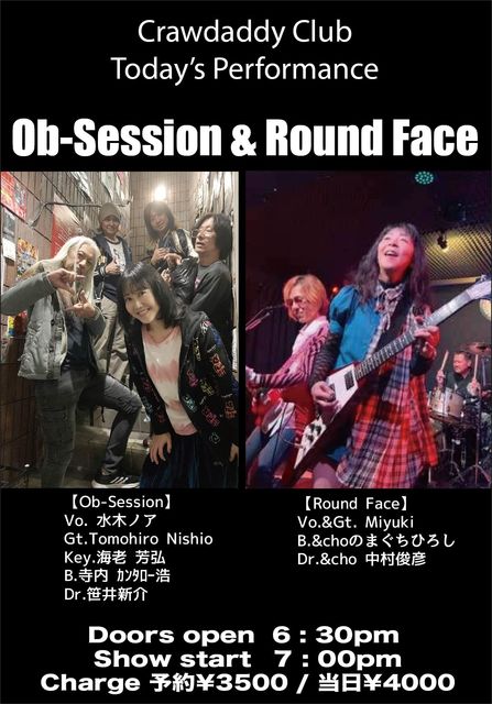 12/6 ËÜÆü¤Î¥é¥¤¥Ö¡¡ Obsession & Round Face Live¡¡ OPEN 18:30 START 19:00 CHARGE ͽÌó\3500 / ÅöÆü\4000¡¡ ¤è¤í¤·¤¯¤ª´ê¤¤¤¤¤¿¤·¤Þ¤¹¡ª¡ª