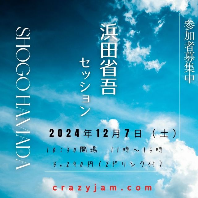 ☆☆第12回 浜田省吾セッション開催します!☆☆ ☆お誘い合わせの上ご参加ください☆彡 日時 2024年 12月7日(土) 10:30オープン 11:00スタート〜15:00終了予定 (終了後打ち上げあり) 会場 立川 CRAZY JAM http://www.crazyjam.com 料金 3,290円(税込み 2ドリンク券付) ※2ドリンク券は(¥550×2)参加チケットに含まれております。 カクテルなど、550円以上のものをご注文される場合は差額を現金でお支払いください。 ◆終了後打ち上げあります。(1ドリンク+フード付き 1,500円) ◆チケットサイ