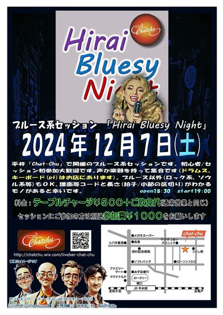 ブルース系セッション開催します! ★2024年12月7日(土) 18:30〜 OPEN 19:00〜 START 〜22:00 音出し終了 ★料金 ・テーブルチャージ500円 ・演奏参加者は別途1,000円 ※飲食店に付き、別途ご飲食を沢山してくださいネ^^ ★ホストメンバー ☆ティーチャー山口&スチューデンツ ・山口 哲也 _ Bluesharp/Vo./MC ・那須 英一 - Bass ・高山 哲哉 _ Drums ・上野 邦雄 _ Guitar 皆様のご予約、ご参加を心よりお待ちしております!!