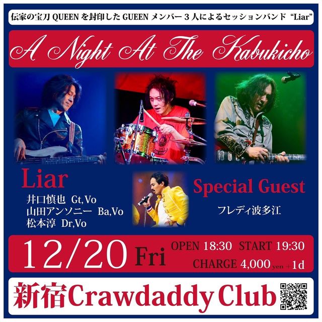 12/20 本日のライブ 『A Night at the Kabukicho』 OPEN 18:30 START 19:30 CHARGE 4000円 ■出演■ 【Liar】 井口慎也 / Gt,Vo 山田アンソニー / Ba,Vo 松本淳 / Dr,Vo 《Special Guest》 フレディ波多江 よろしくお願いいたします!!
