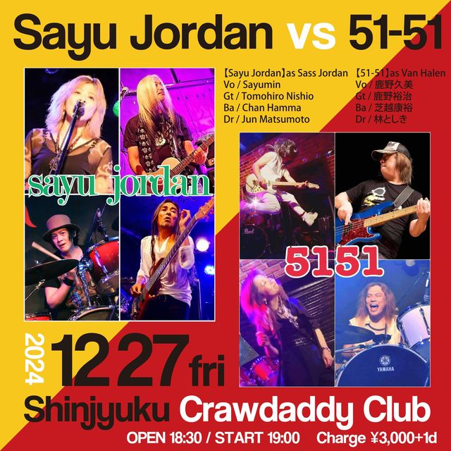 12/27 本日のライブ Sayu Jordan vs 51-51 OPEN 18:30 START 19:00 CHARGE 3000円 act 【Sayu Jordan】 as Sass Jordan Vo / Sayumin Gt / Tomohiro Nishio Ba / Chan Hamma Dr / Jun Matsumoto 【51-51】as Van Halen Vo / 鹿野久美 Gt / 鹿野裕治 Ba / 芝越康裕 Dr / 林としき よろしくお願いいたします!!