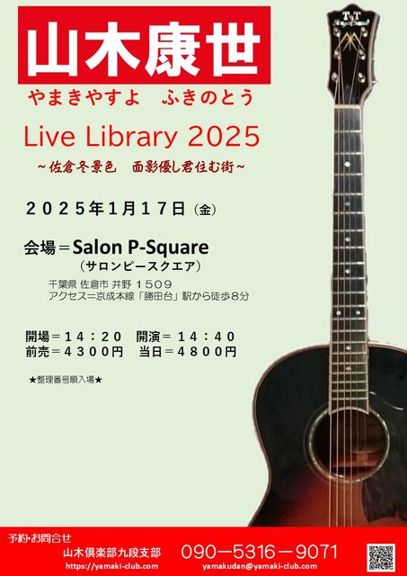 「山木康世 Live Library 2025」 〜佐倉冬景色 面影優し君住む街〜 会場=Salon P-Square(サロンピースクエア) https://p-square.myds.me/ 千葉県 佐倉市 井野 1509 アクセス=京成本線「勝田台」駅から徒歩8分 開場14:20 開演14:40 前売4300円 当日4800円 ★整理番号順入場★ 予約・問合せ 山木倶楽部九段支部 090-5316-9071 yamakudan@yamaki-club.com