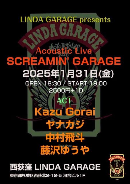 1·î31Æü(¶â) ÅìµþÅÔ À¾²®·¦ ¥ê¥ó¥À¥¬¥ì¡¼¥¸ https://map.yahoo.co.jp/v2/place/b6v0R9PeLBQ ¡ÖSCREAMIN' GARAGE¡× ½Ð±é: ÃæÂ¼ÈôÅÍ / Æ£Âô¤æ¤¦¤ä / Kazu Gorai / ¥ä¥Ê¥«¥¸ open18:30 start19:00 ¥Á¥ã¡¼¥¸2500±ß+1DRINK ¢¨ÃæÂ¼ÈôÅÍ¥½¥í¤Ç¤Î½Ð±é¤Ë¤Ê¤ê¤Þ¤¹¡£19:45¡Á¤Î½Ð±é¡£