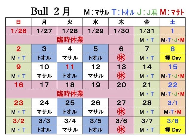 ÎáÏ£·Ç¯£²·îͽÄê¤Ç¤¹¡£ Á᤯¤â1·î±ý¤ó¤ÇÇ¡·îÅþÍè¤Ç¤¹¤Í¡£ ¡ù êîDay ¡¡ £²·î£¸Æü¡ÊÅÚ¡Ë17»þ¤«¤é21»þ¤Þ¤Ç ¡¡ ê¥ó¥ê¡¼¤Ç¤¹¡£ ¢¨ 21»þ¤«¤é¤ÏÃå°áOK¤Î¤Ç¤¹¡£ ¡ù ¤ªµÙ¤ß ¡¡ ÄêµÙÆü³ÆÌÚÍË¡¡£¶Æü¡¦£±£³Æü¡¦£²£·Æü ¡¡ Î×»þµÙ¶È¡¡£±£¶Æü(Æü)¡Á £²£°Æü(ÌÚ¡Ë ¡ù Bull¥Ü¥¦¥ê¥ó¥°Âç²ñ ¡¡3·î16Æü¡ÊÆü¡Ë13»þȾ¼õÉÕ ¡¡14»þ¡¡3¥²¡¼¥à¥¹¥¿¡¼¥È ¡¡¥Ü¥¦¥ê¥ó¥°Âç²ñ½ªÎ»¸åº©¿Æ²ñͽÄê ¡¡»²²ÃÅù¥Þ¥¹¥¿¡¼¤ËÌ䤤¹ç¤ï¤»¤Æ²¼¤µ¤¤¡£ ¡¡ÅßËÜÈ֤Ǵ¨¤µ¤â°ìÃʤȸ·¤·¤¯¤Ê¤ê¤Þ¤¹¤¬¡¢³Ú¤·¤ó¤Ç²á¤´¤·¤Þ¤·¤ç¤¦¡ª