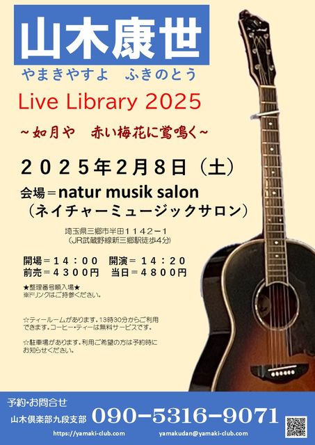 「山木康世 Live Library 2025」 〜如月や 赤い梅花に鴬鳴く〜 会場= natur musik salon(ネイチャーミュージックサロン) https://www.naturmusiksalon.com/ 埼玉県三郷市半田1142ー1 (JR武蔵野線新三郷駅徒歩4分) 開場=14:00 開演=14:20 前売=4300円 当日=4800円 ★整理番号順入場★ ☆ティールームがあります。13時30分からご利用できます。コーヒー・ティーは無料サービスです。 ☆駐車場があります。利用ご希望の方は予約時にお知らせください。 予約・問合せ 090−5316−