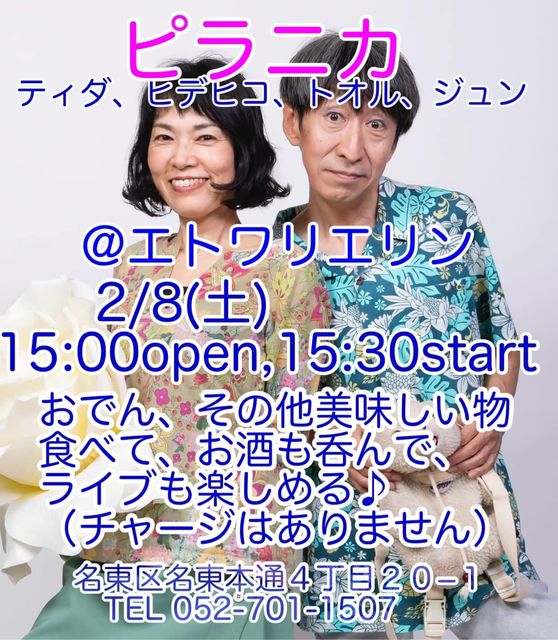 2月8日(土) 愛知県 名古屋 エトワリエ鈴 https://map.yahoo.co.jp/v3/place/QHdOyflBnQI 出演:ピラニカ(ティダ、ヒデヒコ、トオル、ジュン) open15:00 start15:30 チャージフリー(無料)