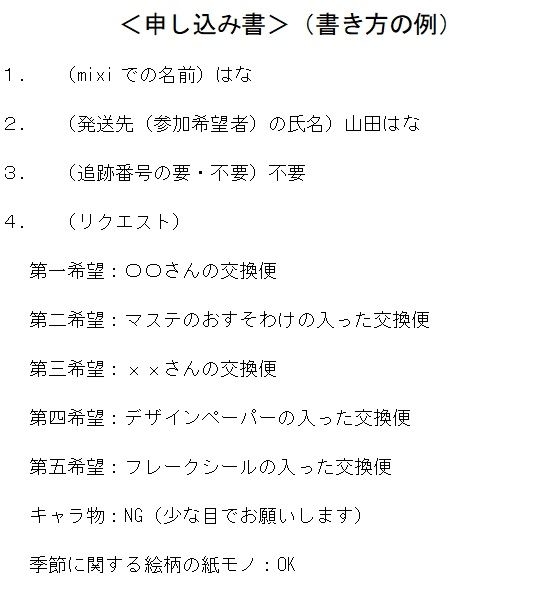 第26回素敵便/交換便練習シャッフル交換会を開催します。 注意:以下に記載されていることすべて読んだうえでの参加をお願いします。 また、こちらのトピックに連絡事項を記載することもありますので、交換会に参加される方は書き込みを チェックするようにしてください。 質問、感想、連絡など個人情報を含まないものすべて こちらのトピックに書き込んでください。 こちらの交換会は、素敵便/交換便の交換を やってみたいという方のためのシャッフル交換会です。 普段素敵便/交換便を交換されている方も参加していただいてもちろんか