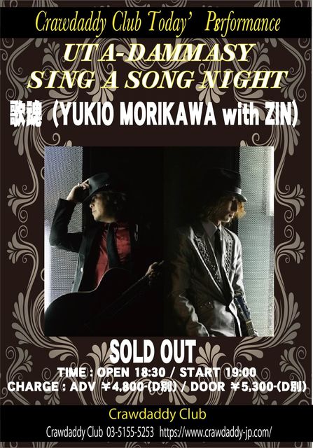 2/8 本日のライブ 『歌魂 〜 歌魂's ACOUSTIC NIGHT!!』 ACT : 歌魂 <森川之雄 with ZIN> TIME : OPEN 18:30 / START 19:00 CHARGE : ADV ¥4,800-(D別) / DOOR ¥5,300-(D別) SOLD OUT となりました。 よろしくお願いいたします!!