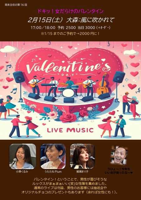 ¡ü³µÍ× £²·î£±£µÆü¡ÊÅÚ¡Ë Â翹¡§É÷¤Ë¿á¤«¤ì¤Æ http://oomorikazefuka.weebly.com/ Âè16²ó¡Ö¥É¥¥Ã¡ª½÷¤À¤é¤±¤Î¥Ð¥ì¥ó¥¿¥¤¥ó¡× 17:00/18:00 ͽÌó 2500 ÅöÆü3000 (+޵ްŽÀŽÞް) ¢¨1/15¤Þ¤Ç¤ÎͽÌó¤Ç2000¡ª ½Ð±é¡§²¬ËܼçǤ¡¢¾®ß·¤¯¤ë¤ß¡¢¤¦¤¿¤¿¤ÍPlum¡¢ÃöÀ¥¤Þ¤ê»Ò ¡ü¥¿¥¤¥à¥¹¥±¥¸¥å¡¼¥ë 18:00¡¡²¬ËܼçǤ 18:35¡¡¾®ß·¤¯¤ë¤ß 19:20¡¡ÃêÁª²ñ 19:35¡¡¤¦¤¿¤¿¤ÍPlum¡¡ 20:20¡¡ÃöÀ¥¤Þ¤ê»Ò 21:05¡¡¥Õ¥£¥Ê¡¼¥ì¡ª 21:15¡¡½ª±é ¡üÆÃ¿§ ¥Ð¥ì¥ó¥¿¥¤¥ó¡ª¤È¤¤¤¦¤³¤È¤Ç¡¢ÃËÀ¤¬´î¤Ó¤½¤¦¤Ê¥ë¥Ã¥¯¥¹¤¬¤Þ¤¡¤Þ¤¡¤¤¤¤(¾Ð)½÷À¿Ø¤ò½¸¤á¤Þ¤·¤¿¡£ Ä̾ï¤Î¥é