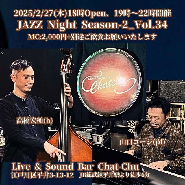 ホストプレーヤーにピアニストの山口コージ氏、ベースに高橋宏種氏をお迎えしてのジャズセッションです。 毎月第4木曜日に開催!! ☆2025年2月27日(木) 18:00〜 OPEN ・19:00頃よりご参加状況を見てスタートします。 ・音出しは22:00までとなっております。 ◆参加費 ¥2,000 ※別途ご飲食をお願いいたします。 ◆ホストプレーヤー ピアノ 山口コージ ベース 高橋宏種 セッションに参加ご希望の方は、リクエスト曲のコードとサイズ・進行等が分かる譜面をお持ちいただくとスムースに進められると思います。