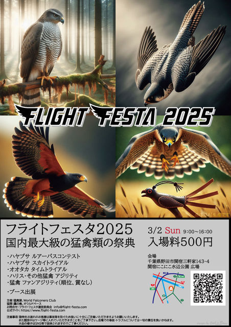 今年で23回目になる国内最大級の猛禽類による祭典『フライトフェスタ2025』を見に行きませんか? 海外では良く行われていますが、日本ではここだけです。 ハヤブサのルアーパスや大鷹によるタイムトライアル、ハリスホークによる障害物競走?など猛禽類の競技会で、色々な競技を間近で見る事が出来ます。 一度見れば解りますが、迫力があり飛ぶ姿はとても美しいです。 昨年はヒメコンドルやペンギンなど珍しい鳥もいましたし、フクロウなども多数来ていますよ。 少しでも猛禽類に興味がある方は一緒に見に行きませんか? 詳細は https://flig