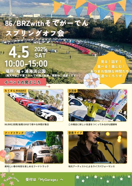86/BRZwithそでがーでん スプリングオフ会 【そでがーでんについて】 『暮らす人も訪れる人も笑顔になる。お互いが高まり合う地域づくり』 イベントステージでは・・・ ワークショップでは・・・ キッチンカー(6台)、キッズコーナー、フリマ、地元野菜など開催いたします。 【オフ会目的】 『見る!話す!食べる!楽しむ!あつまれ愉快な仲間たち!友達つくろうぜ!』 この機会に友達作りませんか? 【参加条件】 公園内マナーの順守・交通ルールの順守・千葉フォルルールの順守(路上駐車禁止、危険行為禁止)を条件とします。 公園内の