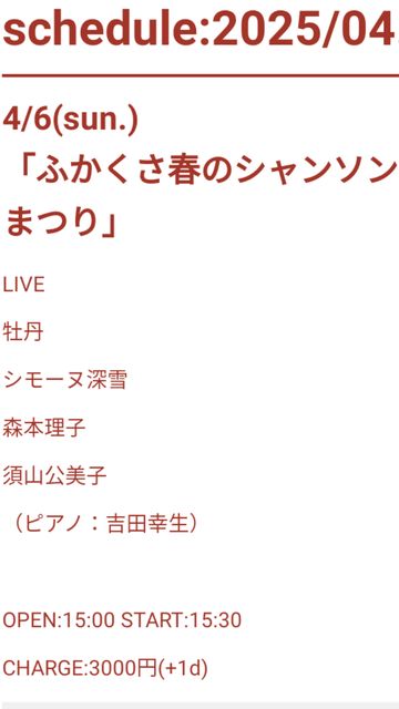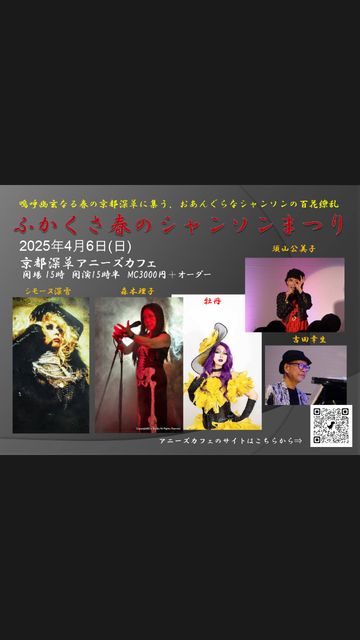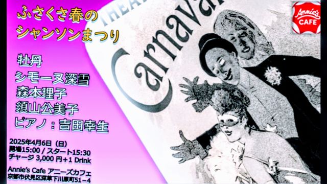 2025 04 06 (sun) @京都深草 アニーズカフェ 須山公美子 / 森本理子 / 牡丹 / シモーヌ深雪 吉田幸生(pf) 3:00〜 / 3:30〜