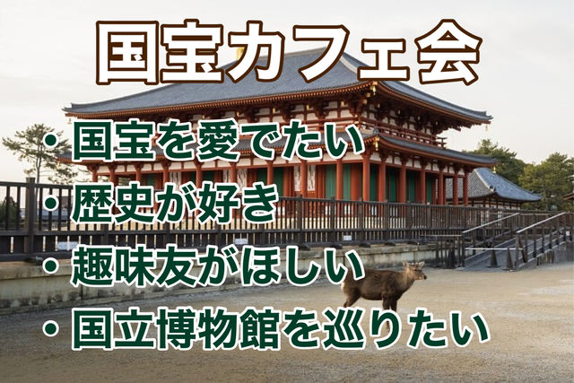 ○●○奈良の友達作り♪@九州カフェ会●○● 奈良の皆さん、はじめまして。 『奈良de国宝カフェ会』を開催します♪ 奈良国立博物館である「超 国宝〜祈りのかがやき」展を観に行って、国宝について語ろう♪という会です。 色んな人に出会って、色んな価値観にふれながら趣味友達作りをしましょう♪♪ その時に出会ったメンバーで交流を楽しむ少人数の交流会です。 自己紹介から始まり、話す内容は国宝や歴史についてです。 まったりおしゃべりを楽しむも良し。 氣になっているテーマを持ち込むも良し。 他の方の話を聞いて楽しむも