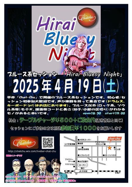 ブルース系セッション開催します! ★2025年4月19日(土) 18:30〜 OPEN 19:00〜 START 〜22:00 音出し終了 ★料金 ・テーブルチャージ500円 ・演奏参加者は別途1,000円 ※飲食店に付き、別途ご飲食を沢山してくださいネ^^ ★ホストメンバー ☆ティーチャー山口&スチューデンツ ・山口 哲也 _ Bluesharp/Vo./MC ・那須 英一 - Bass ・高山 哲哉 _ Drums ・上野 邦雄 _ Guitar 皆様のご予約、ご参加を心よりお待ちしております!!