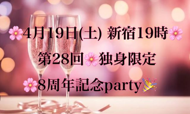 おつかれさまです♪ 4月19日(土) 新宿19時〜21時♪(2h) 第28回独身限定 8周年記念party 前回の新宿会にご参加されたお二方から嬉しいご報告をいただきました!末永くお幸せに〜♡ 当会の趣旨としては、美味しいお料理やお酒を飲みながら自然の流れで会話を楽しんでいただく大人のフリースタイル恋活婚活飲み会になります♫ 参加資格は35歳〜56歳までの恋活婚活をしている独身フリーの方♪ 募集人数は30名まで♪ 飲み放題生付き+お料理7品コースになります(๑´ڡ`๑) コース料理はこん